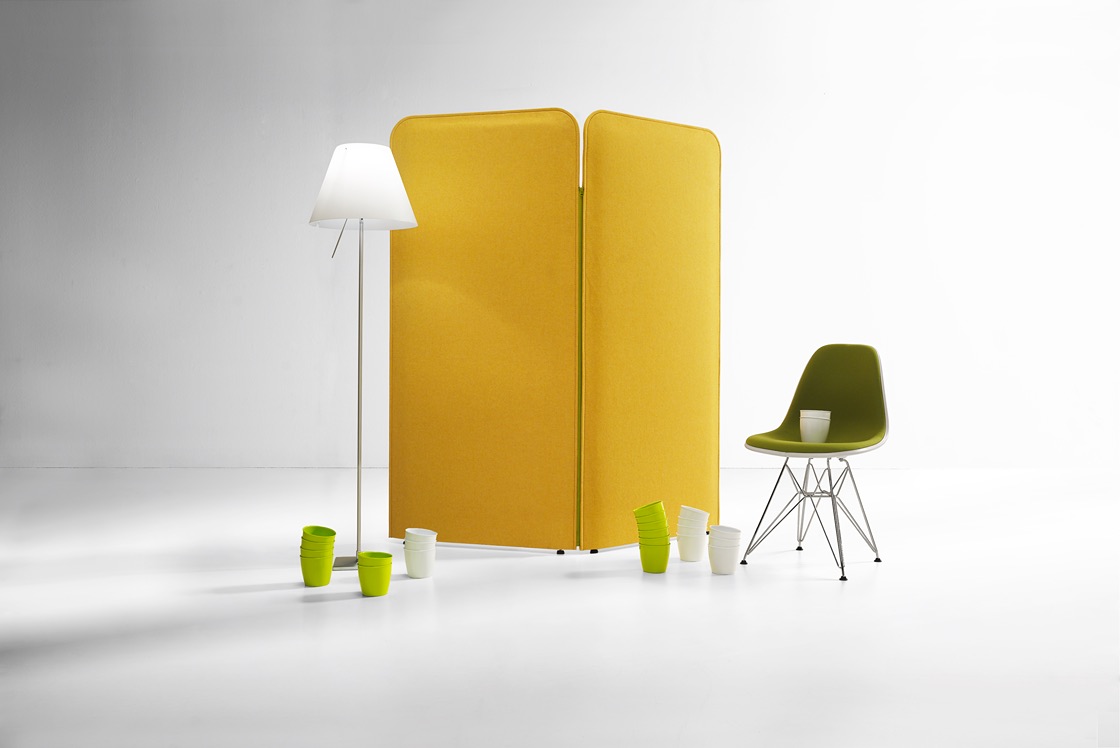 Paneles fonoabsorbentes de forma rectangular en fibra multidensidad, con posibilidad de enganche en línea con cremalleras de colores, o se pueden utilizar individualmente con una base ponderada que garantice su estabilidad.