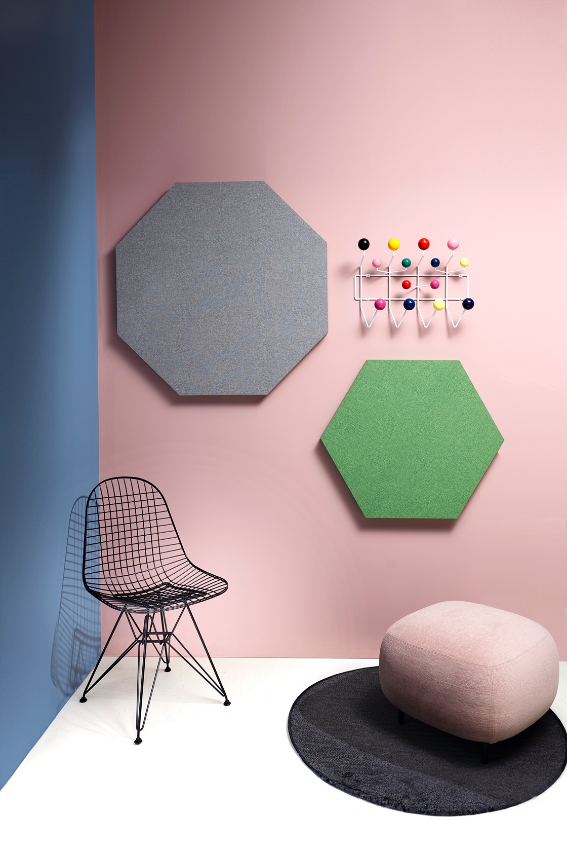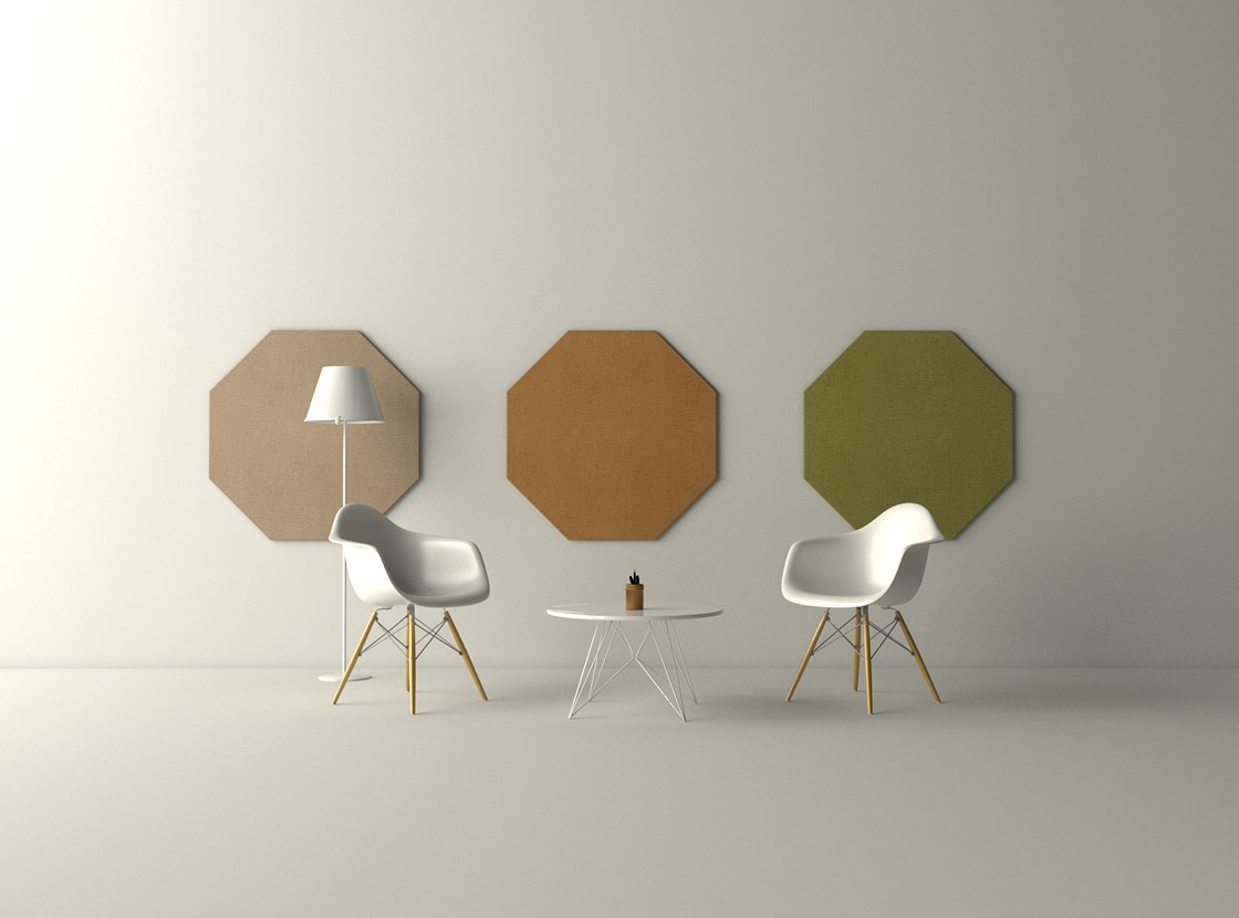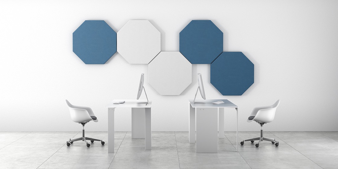 Paneles fonoabsorbentes de forma octogonal en fibra de poliéster de 5 o 3 cm de espesor.