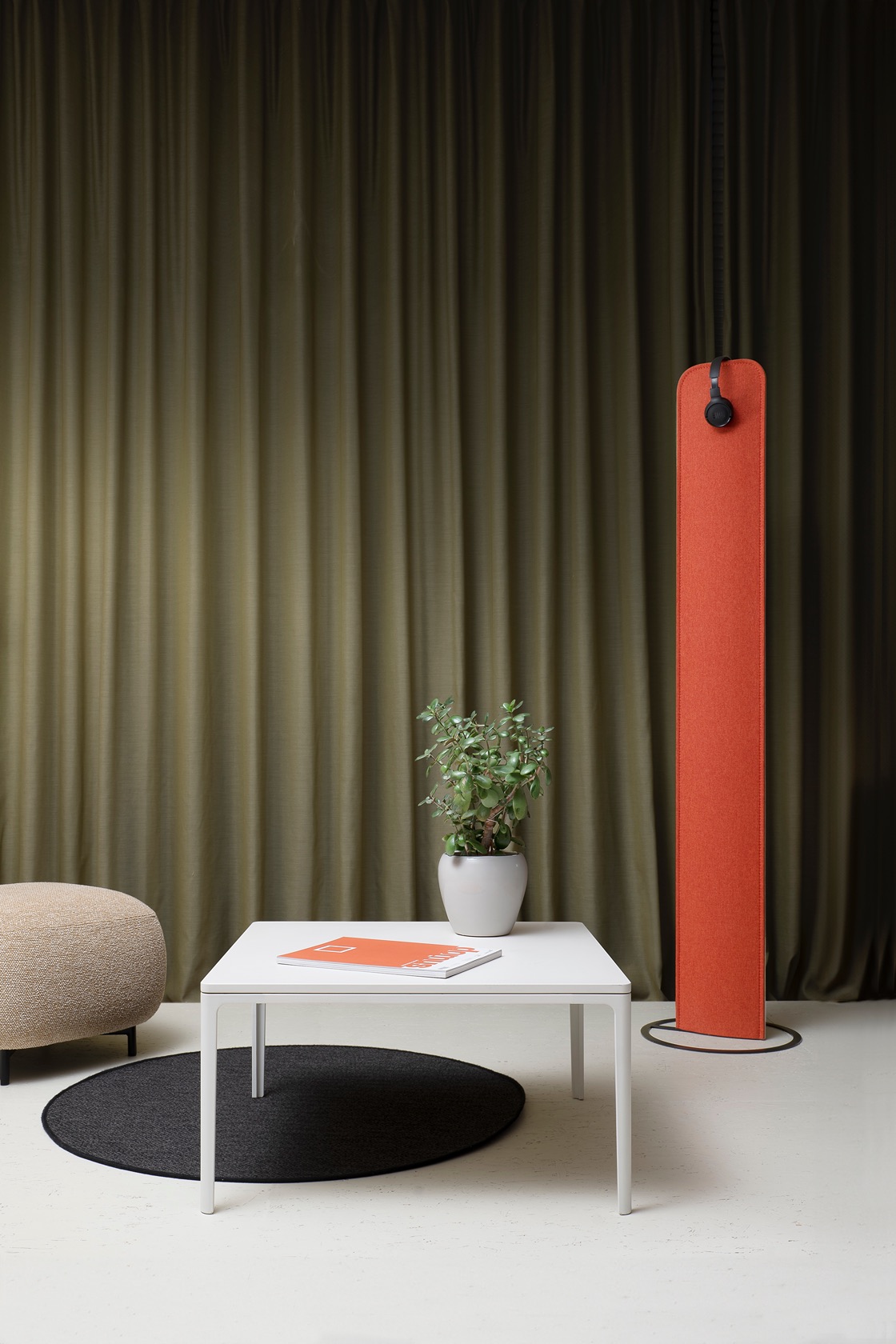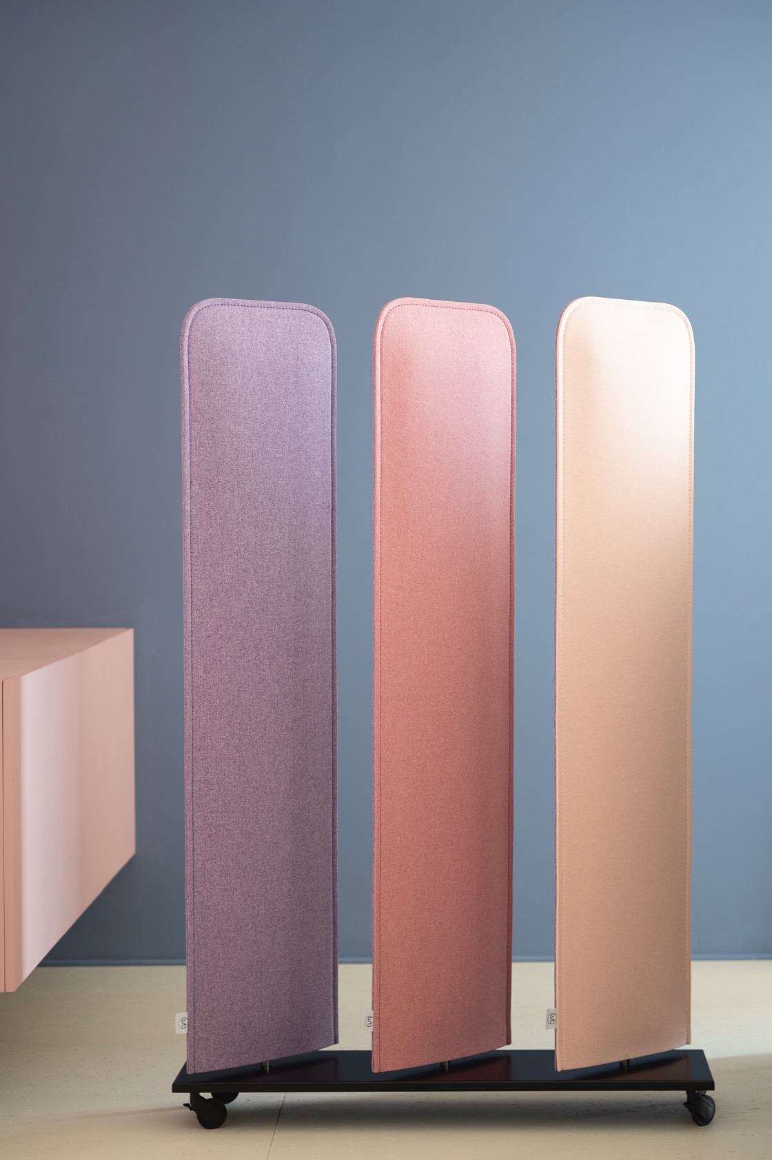 Levantemos el telón sobre Ouverture: un sistema compuesto por tres paneles divisores fonoabsorbentes que puedes transportar fácilmente donde y cuando lo necesites, ¡gracias a la base de metal pintado con ruedas!