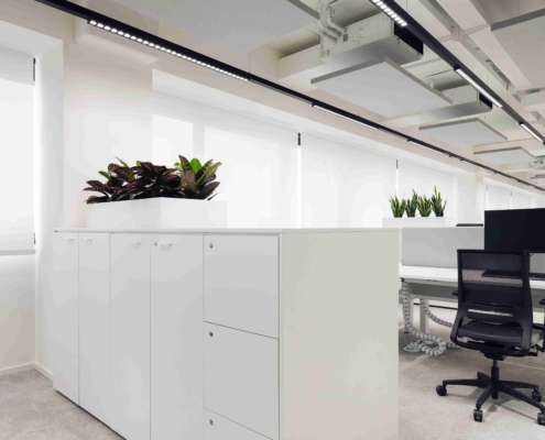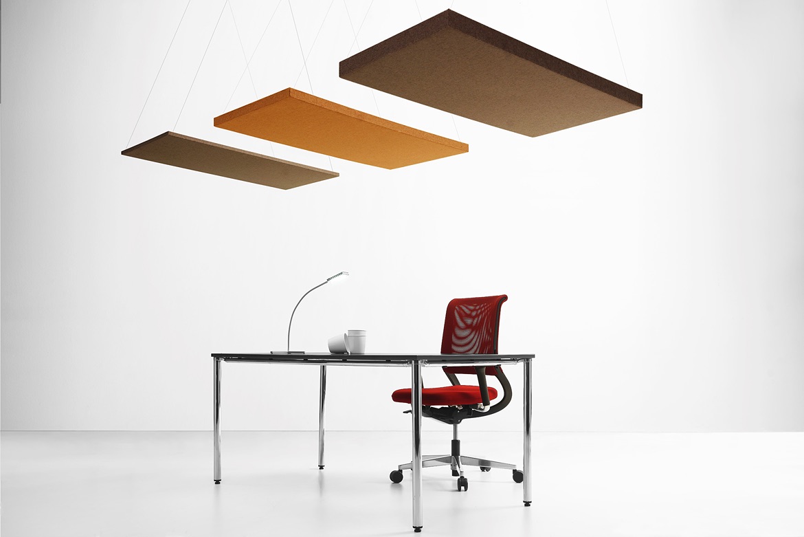 En el techo, los cables orientables, también disponibles individualmente, ofrecen la posibilidad de bajar el panel del techo a diferentes alturas e inclinaciones en función del resultado acústico que se desee obtener.