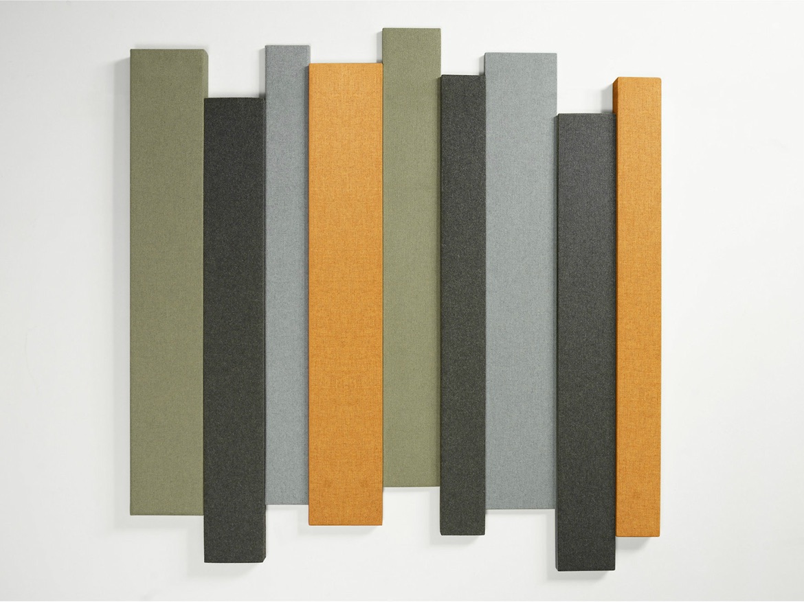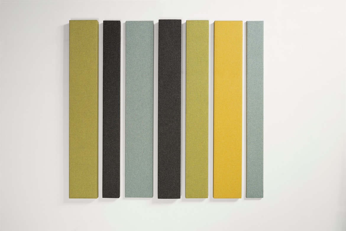 Paneles fonoabsorbentes en fibra de poliéster de 5 o 3 cm de espesor, de forma rectangular con altura fija y 3 anchos estándar, concebidos por el diseñador Pierfrancesco Rosada.
