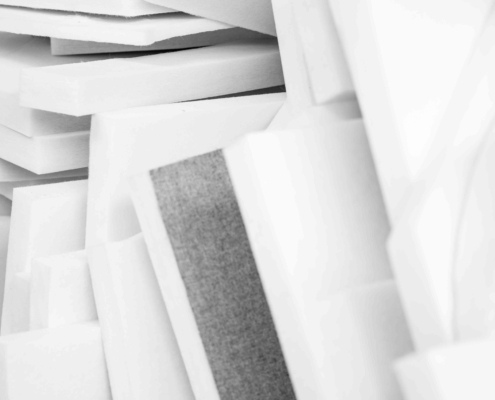 Pannello fonoassorbente bifacciale tipo baffle a soffitto o a parete in fibra di poliestere PET termolisciata e termolegata ignifuga con densità 50 kg/m3 e spessore del pannello 50 mm. I pannelli non sono dotati di rivestimento in tessuto né di struttura di irrigidimento (telaio) al fine di garantire le migliori performances acustiche
